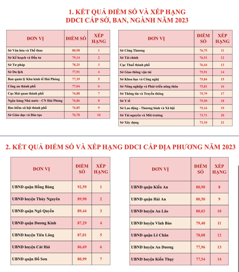 Cấp địa phương có số điểm trung bình đạt 83,44 điểm, tăng 2,66 điểm so với năm 2022. Trong đó, UBND quận Hồng Bàng đạt mức điểm 92,59 đứng thứ nhất, 9 cơ quan đạt mức ở mức điểm tốt và 4 cơ quan đạt mức điểm khá.