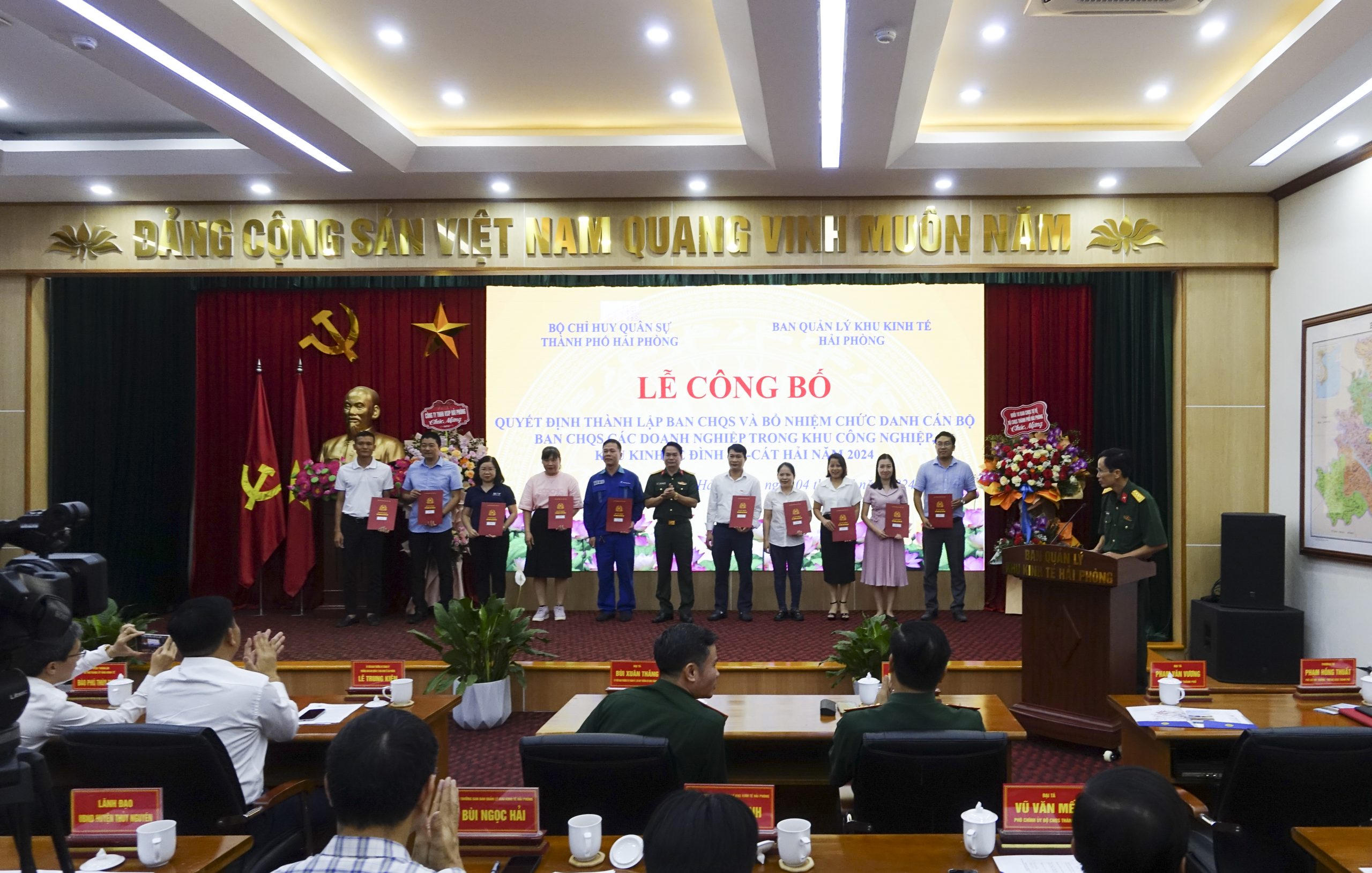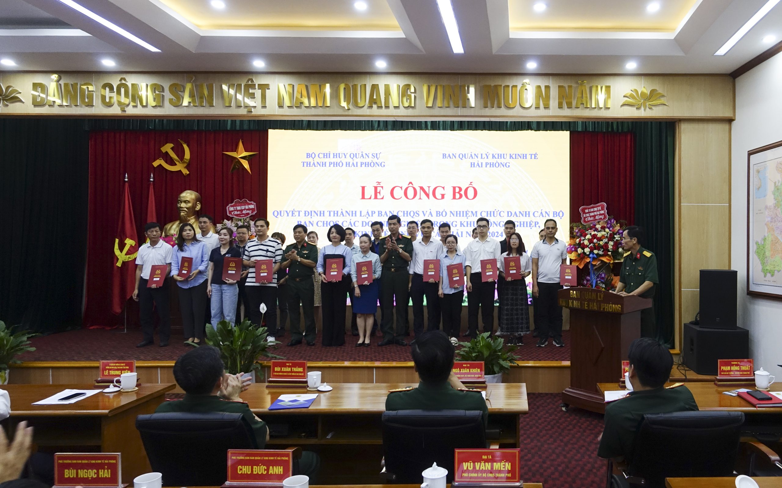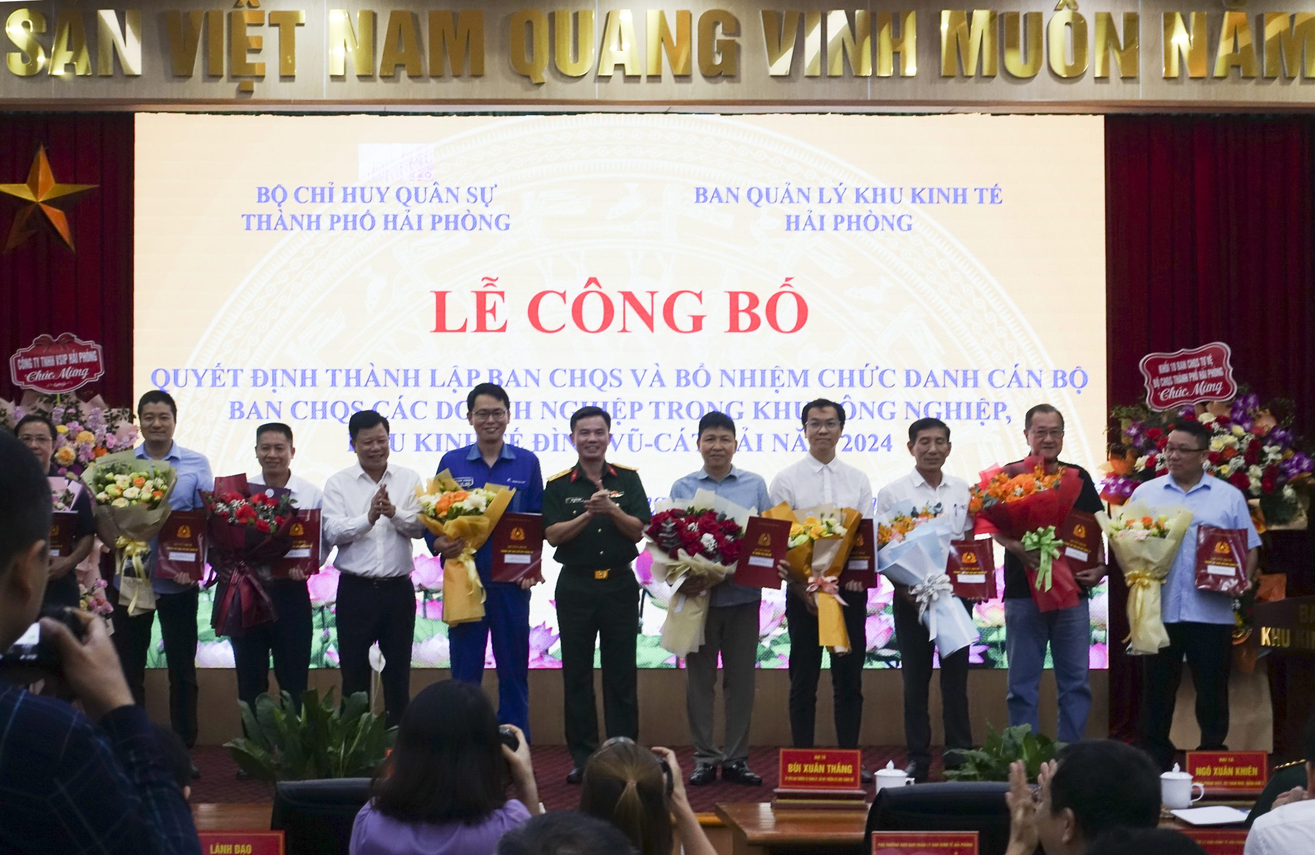 Chiều 4/5/2024, Ban Quản lý Khu Kinh tế Hải Phòng phối hợp Bộ Chỉ huy quân sự thành phố tổ chức Lễ công bố Quyết định thành lập Ban Chỉ huy quân sự và bổ nhiệm chức danh cán bộ Ban Chỉ huy quân sự các doanh nghiệp trong khu công nghiệp, khu kinh tế Hải Phòng năm 2024. Tham dự buổi lễ có đồng chí Lê Trung Kiên Ủy viên Ban Thường vụ Thành ủy, Trưởng ban Ban Quản lý Khu Kinh tế Hải Phòng; đồng chí Bùi Xuân Thắng Ủy viên Ban Thường vụ Thành ủy, Chỉ huy trưởng Bộ Chỉ huy quân sự thành phố chủ trì. Cùng dự có đại diện lãnh đạo Quân khu 3; các sở, ban, ngành, địa phương liên quan; 11 doanh nghiệp thành lập đơn vị tự vệ.