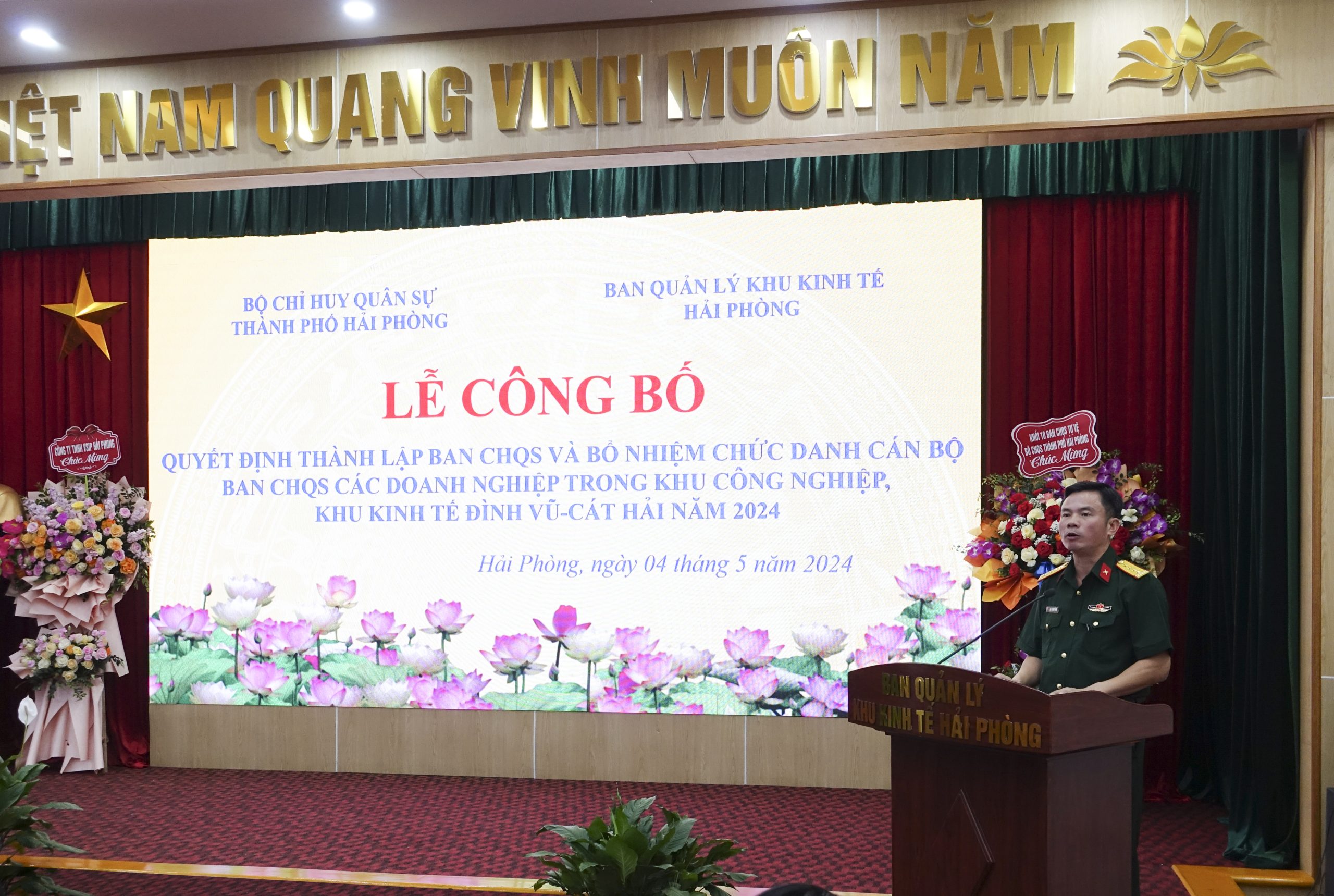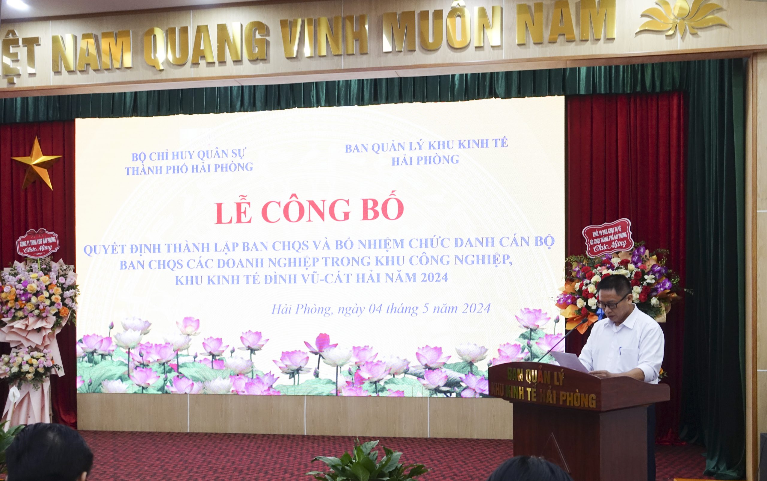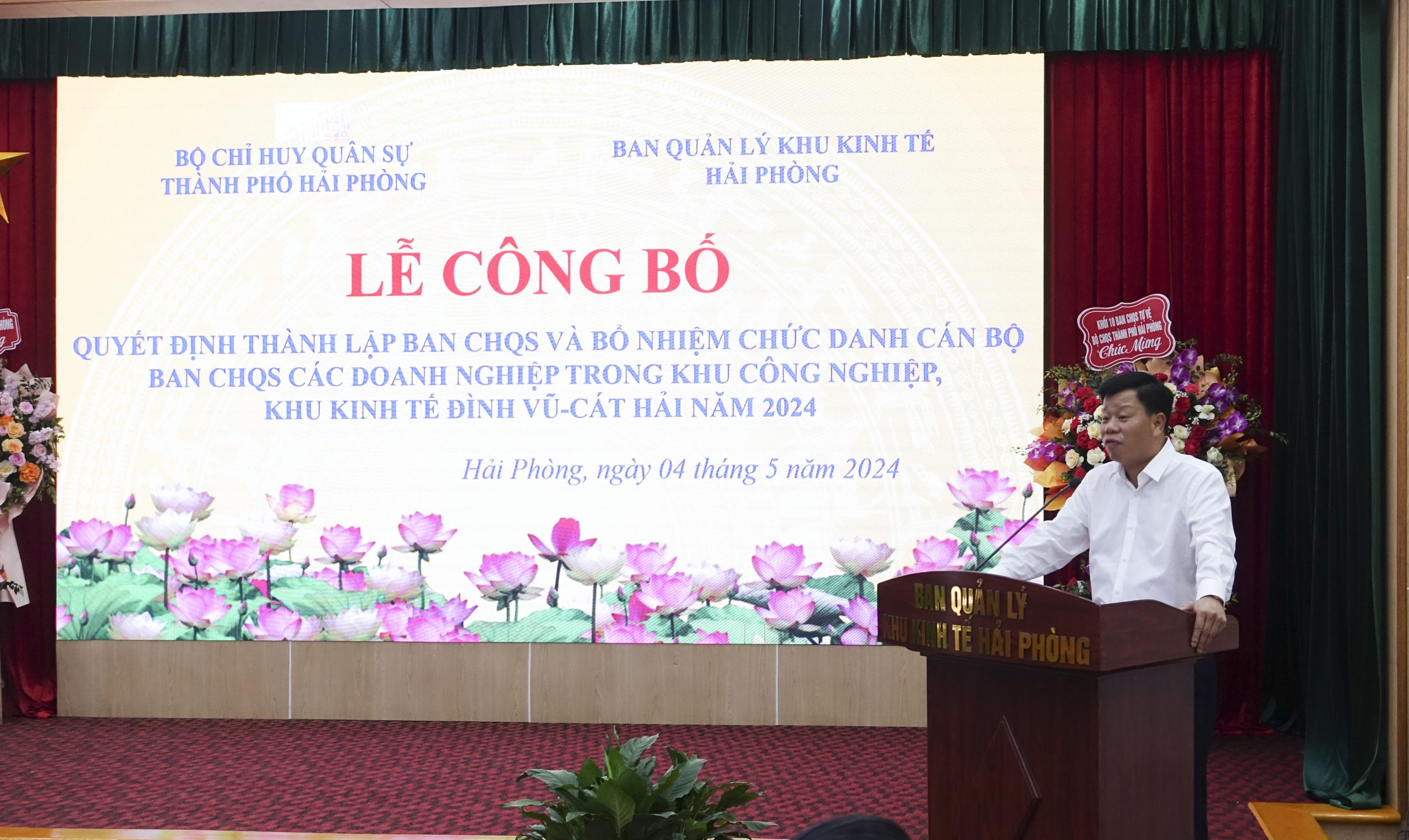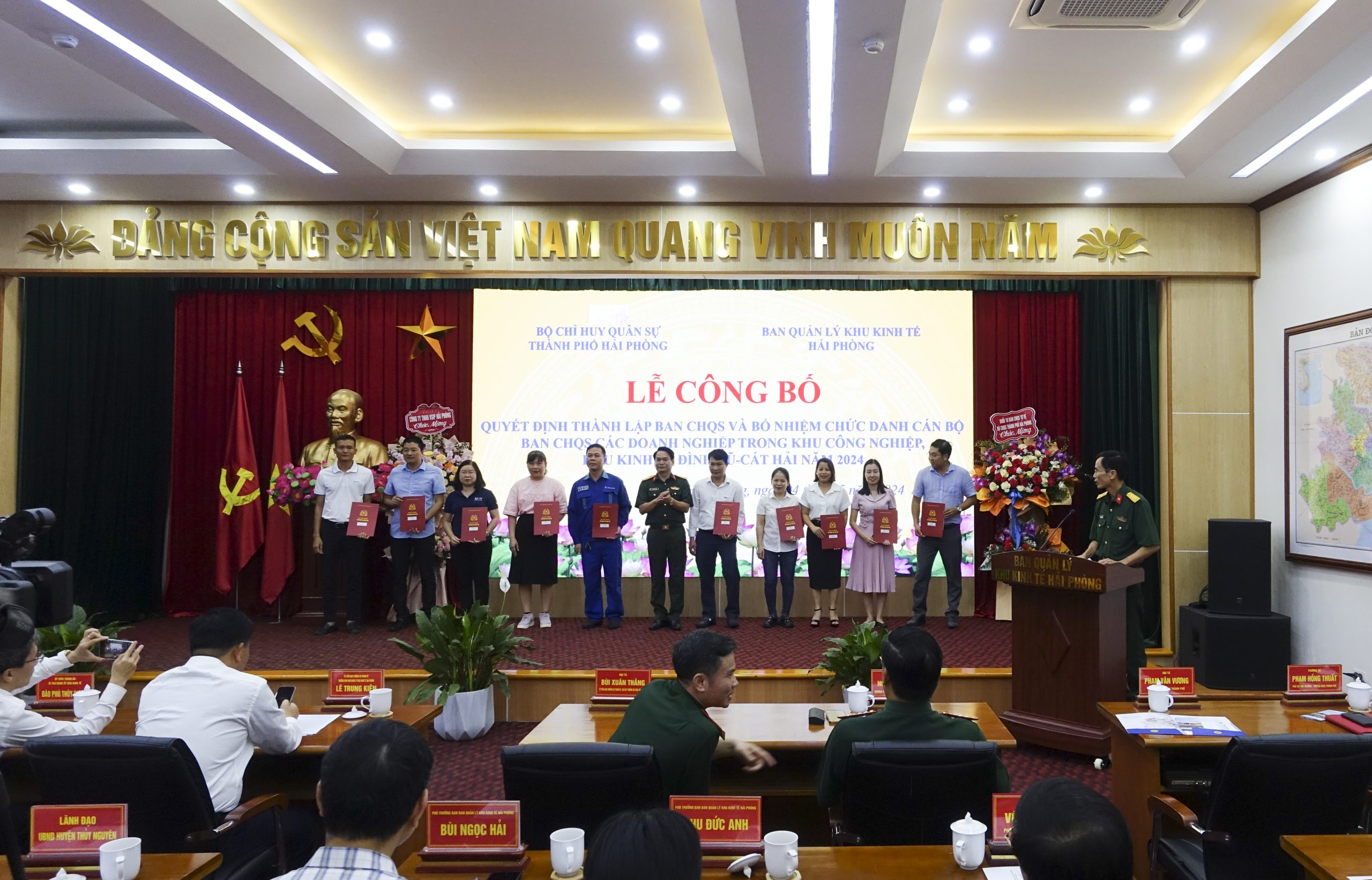 Chiều 4/5/2024, Ban Quản lý Khu Kinh tế Hải Phòng phối hợp Bộ Chỉ huy quân sự thành phố tổ chức Lễ công bố Quyết định thành lập Ban Chỉ huy quân sự và bổ nhiệm chức danh cán bộ Ban Chỉ huy quân sự các doanh nghiệp trong khu công nghiệp, khu kinh tế Hải Phòng năm 2024. Tham dự buổi lễ có đồng chí Lê Trung Kiên Ủy viên Ban Thường vụ Thành ủy, Trưởng ban Ban Quản lý Khu Kinh tế Hải Phòng; đồng chí Bùi Xuân Thắng Ủy viên Ban Thường vụ Thành ủy, Chỉ huy trưởng Bộ Chỉ huy quân sự thành phố chủ trì. Cùng dự có đại diện lãnh đạo Quân khu 3; các sở, ban, ngành, địa phương liên quan; 11 doanh nghiệp thành lập đơn vị tự vệ.