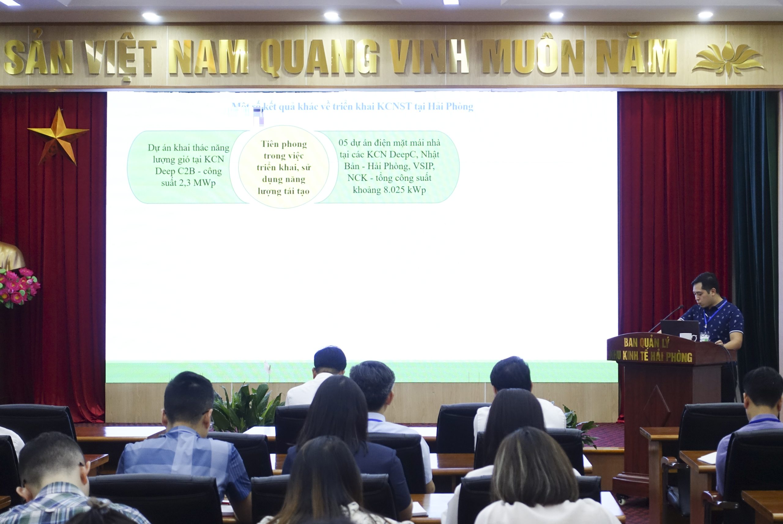 Trong buổi sinh hoạt, Phòng Tài nguyên và Môi trường tham gia báo cáo do đồng chí Nguyễn Văn Vương chuyên viên phòng Tài nguyên và Môi trường trình bày chuyên đề Tổng quan về phát triển khu công nghiệp sinh thái tại Việt Nam và Hải Phòng