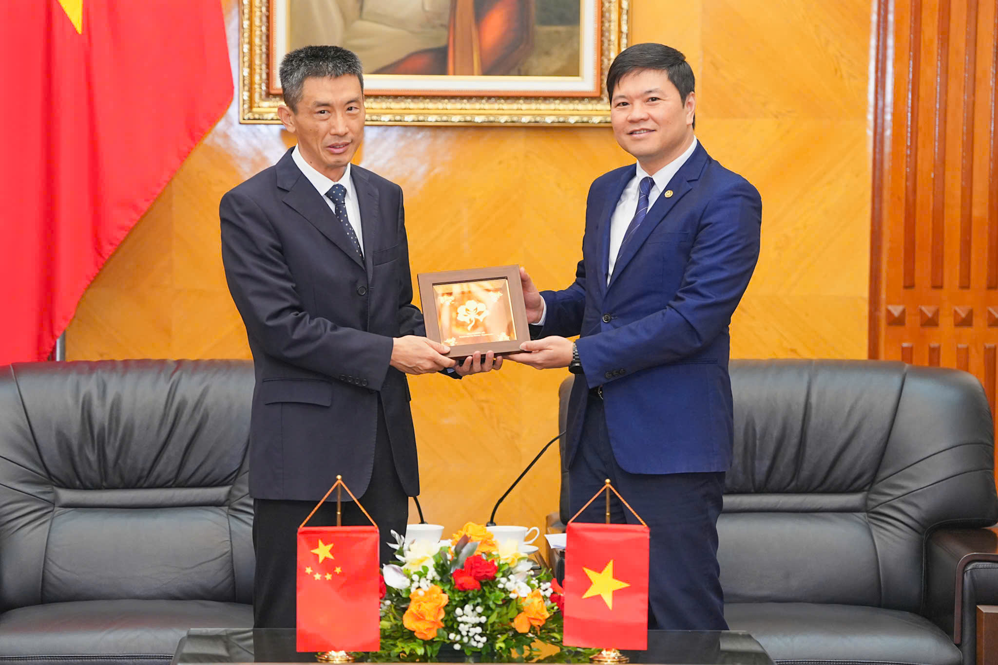 Phó Chủ tịch UBND thành phố Hải Phòng Hoàng Minh Cường và Phó Thị trưởng thành phố Phòng Thành Cảng Trần Quang Quýnh trao quà lưu niệm.