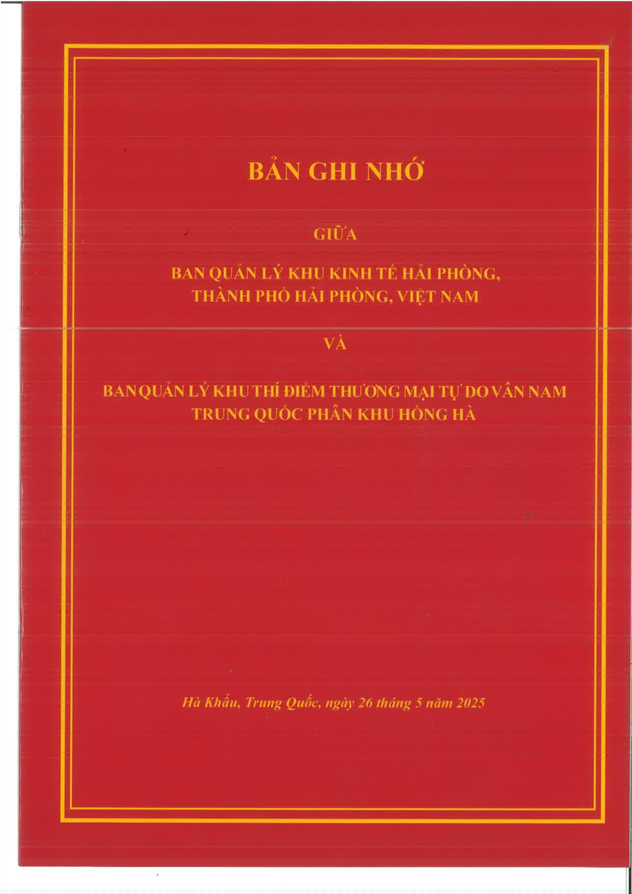 BẢN GHI NHỚ HỢP TÁC GIỮA BAN QUẢN LÝ KHU KINH TẾ HẢI PHÒNG VÀ BAN QUẢN LÝ KHU THÍ ĐIỂM THƯƠNG MẠI TỰ DO VÂN NAM – PHÂN KHU HỒNG HÀ (TRUNG QUỐC)