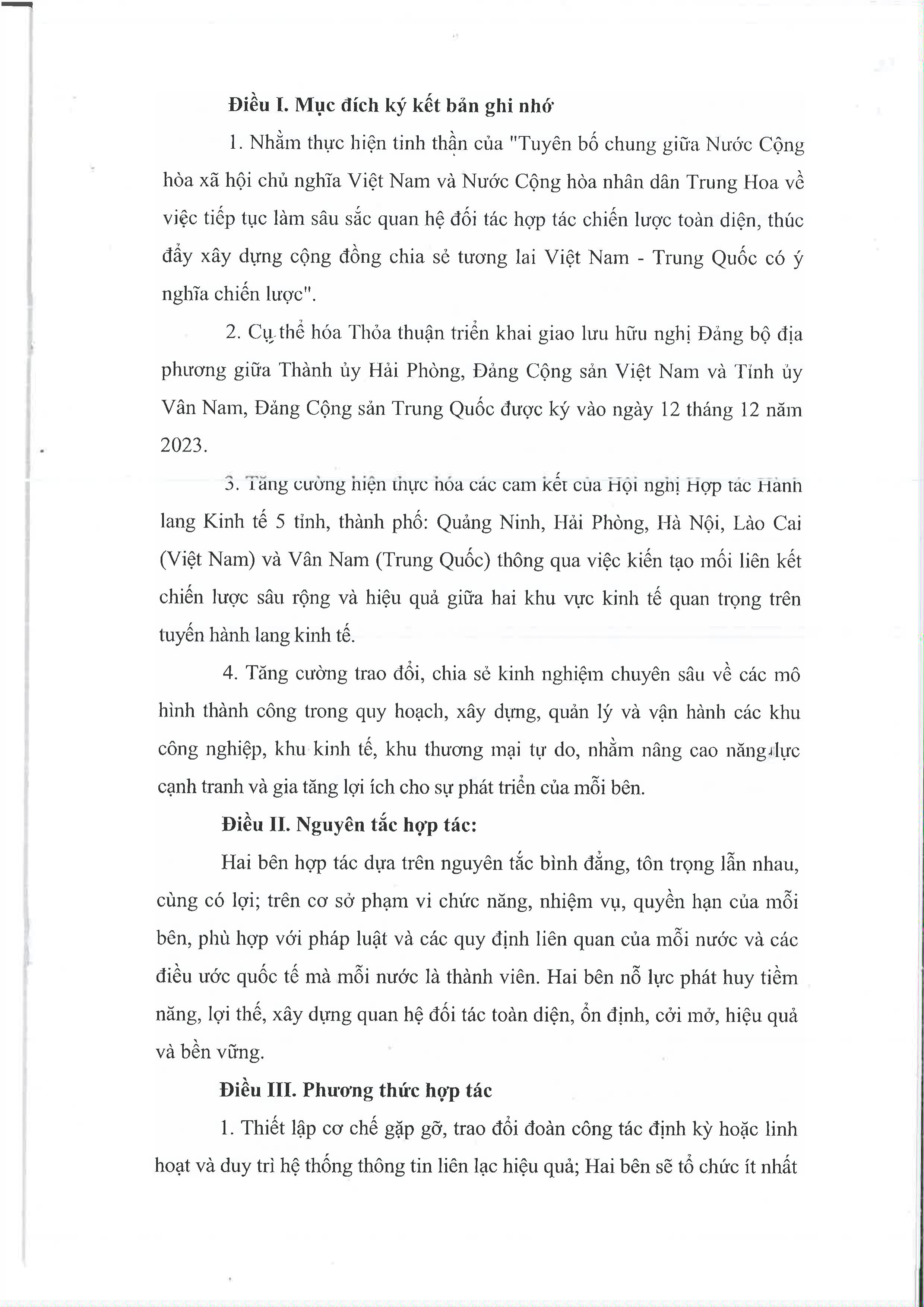 Bản ghi nhớ hợp tác nhằm cụ thể hóa Thỏa thuận triển khai giao lưu hữu nghị Đảng bộ địa phương giữa Thành ủy Hải Phòng, Đảng Cộng sản Việt Nam và Tỉnh ủy Vân Nam, Đảng Cộng sản Trung Quốc được ký vào ngày 12 tháng 12 năm 2023; các cam kết của Hội nghị Hợp tác Hành lang Kinh tế 5 tỉnh, thành phố: Quảng Ninh, Hải Phòng, Hà Nội, Lào Cai (Việt Nam) và Vân Nam (Trung Quốc) thông qua việc kiến tạo mối liên kết chiến lược sâu rộng và hiệu quả giữa hai khu vực kinh tế quan trọng trên tuyến hành lang kinh tế. Đồng thời qua đó tăng cường trao đổi, chia sẻ kinh nghiệm chuyên sâu về các mô hình thành công trong quy hoạch, xây dựng, quản lý và vận hành các khu công nghiệp, khu kinh tế, khu thương mại tự do, nhằm nâng cao năng lực cạnh tranh và gia tăng lợi ích cho sự phát triển của mỗi bên.