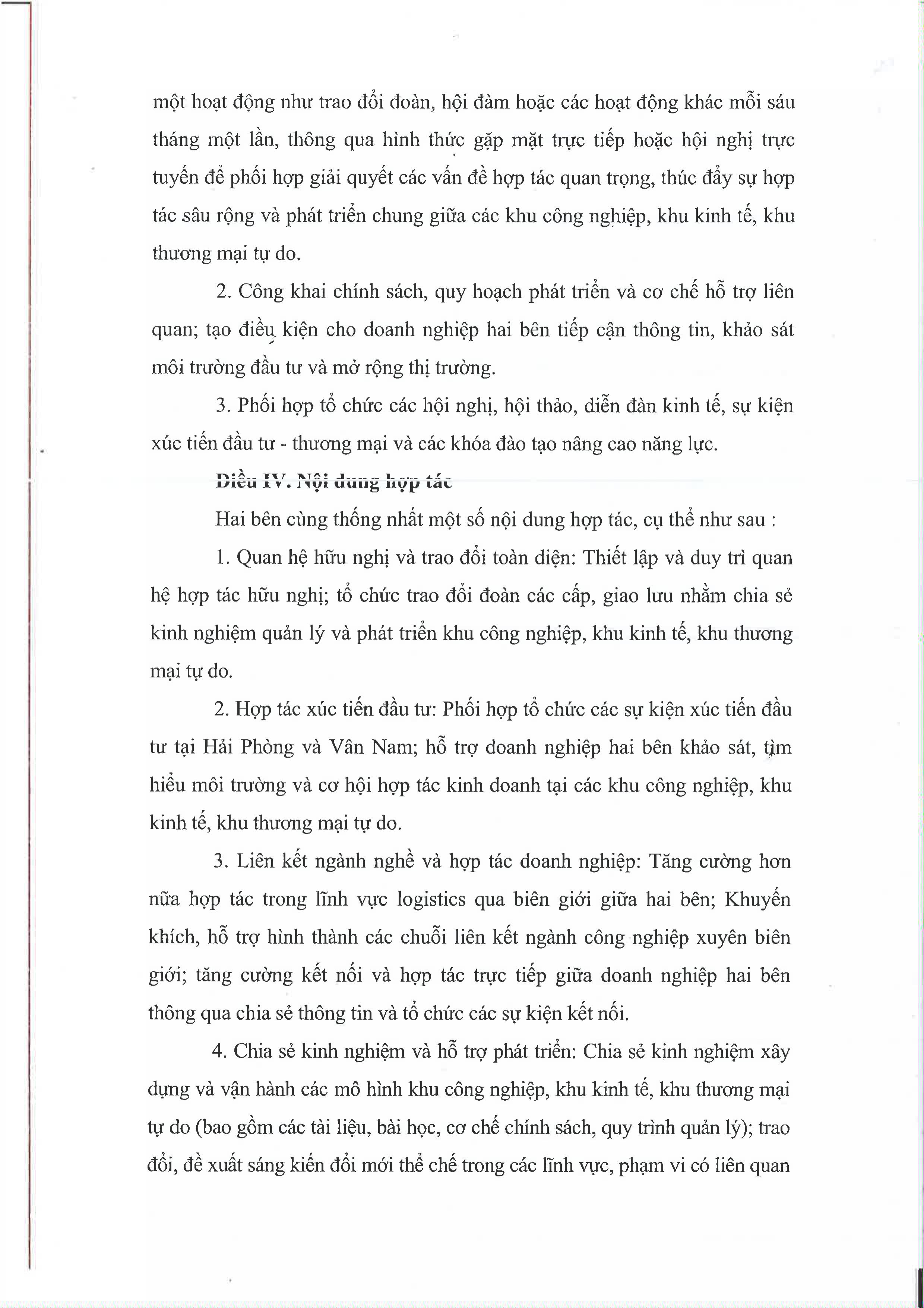 2. Hợp tác xúc tiến đầu tư: Phối hợp tổ chức các sự kiện xúc tiến đầu tư tại Hải Phòng và Vân Nam; hỗ trợ doanh nghiệp hai bên khảo sát, tìm hiểu môi trường và cơ hội hợp tác kinh doanh tại các khu công nghiệp, khu kinh tế, khu thương mại tự do.