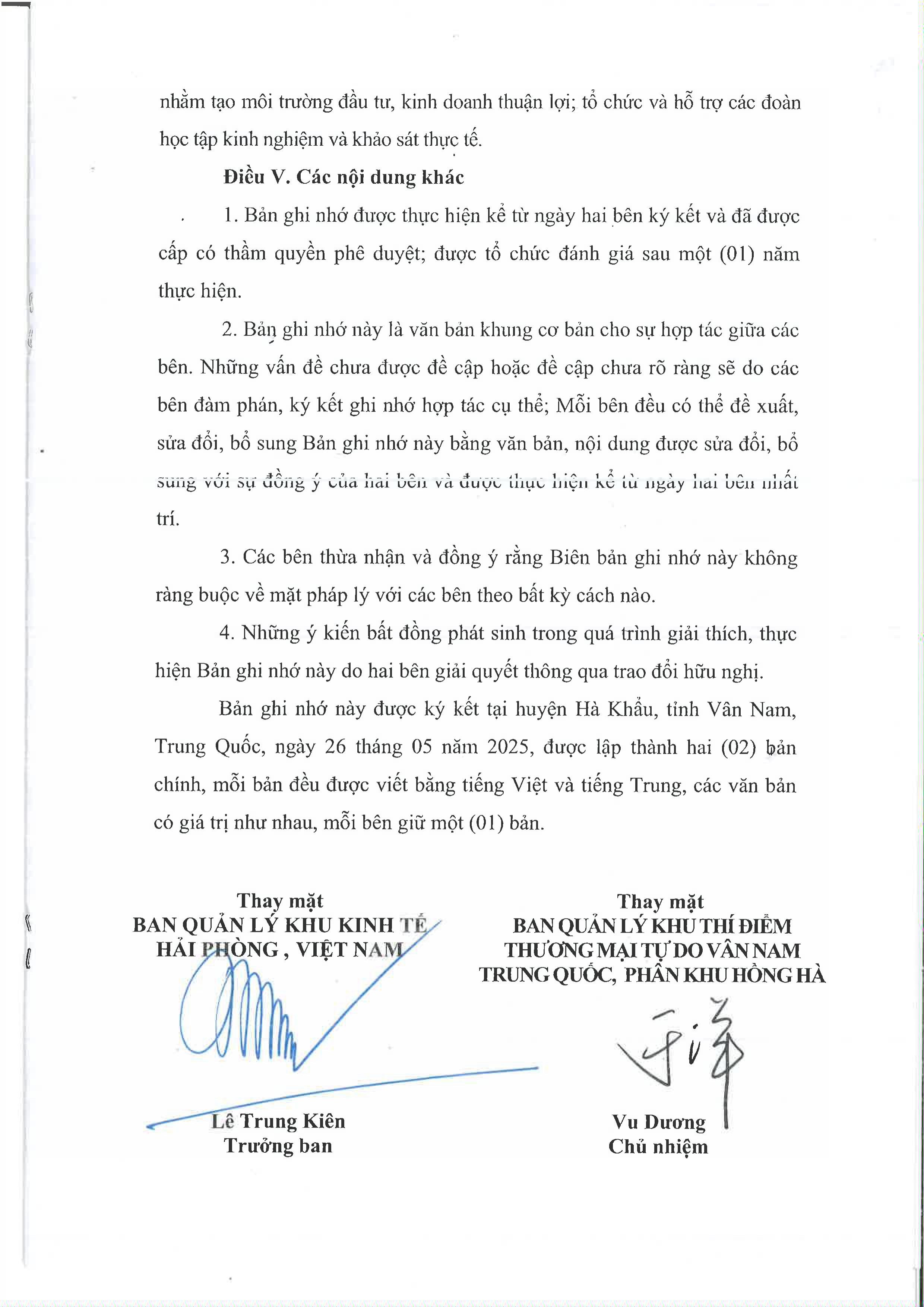 Ngày 26/5/2025, trong khuôn khổ chuyến công tác của Đoàn đại biểu thành phố Hải Phòng tại huyện Hà Khẩu, châu Hồng Hà, tỉnh Vân Nam, Trung Quốc, được sự nhất trí của cấp có thẩm quyền, Ban Quản lý Khu kinh tế Hải Phòng Ban Quản lý Khu thí điểm thương mại tự do Vân Nam – phân khu Hồng Hà đã ký kết Bản ghi nhớ hợp tác, theo đó hai bên cùng thống nhất một số nội dung hợp tác, cụ thể như sau: