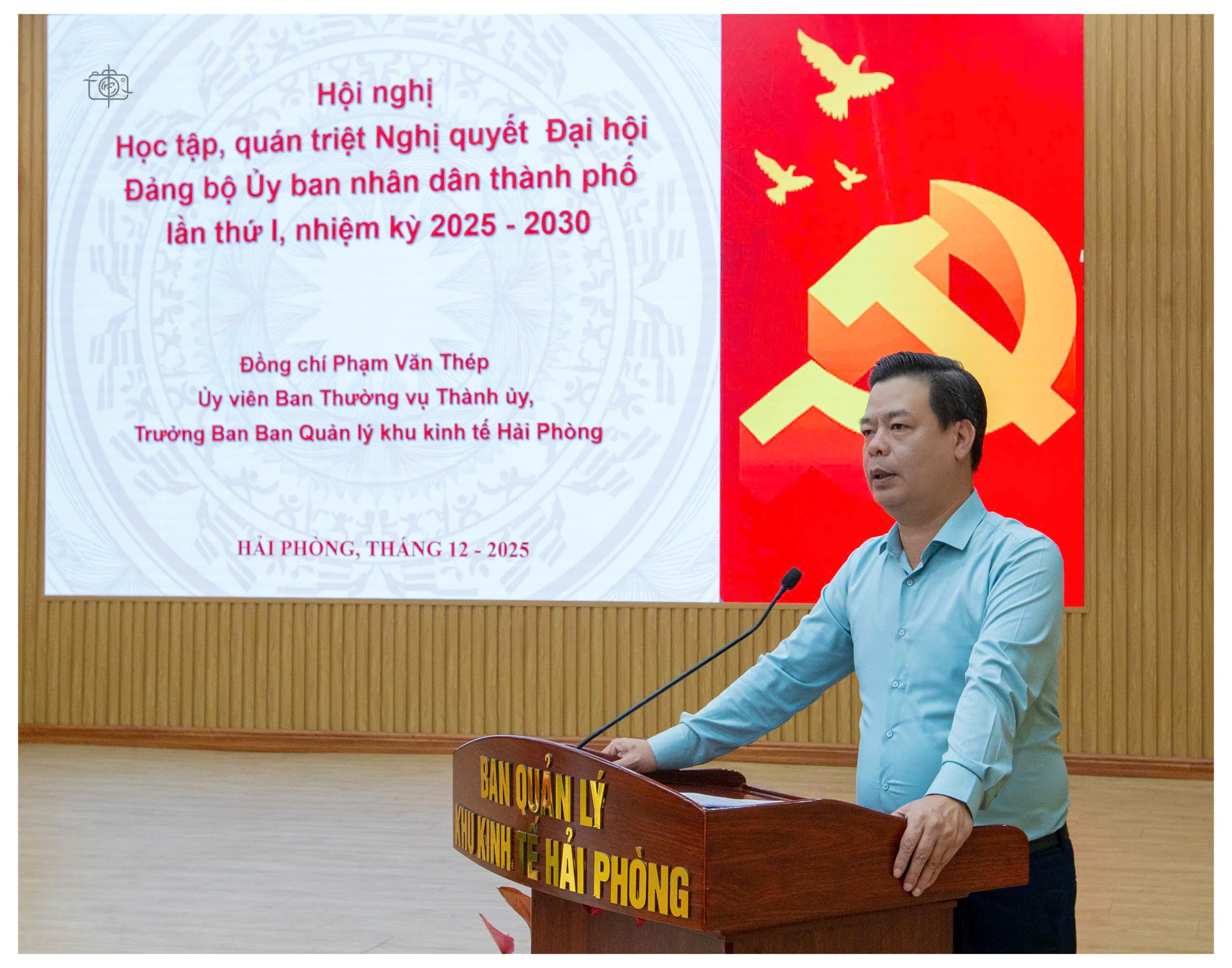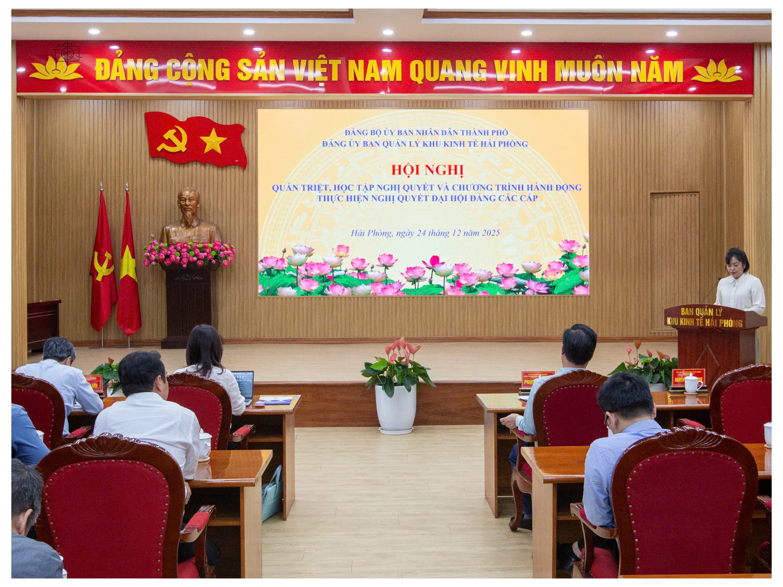 Thực hiện Chương trình công tác năm 2025; Quy chế làm việc của Đảng ủy và các nội dung chỉ đạo của Đảng ủy Ủy ban nhân dân Thành phố về tiếp tục tổ chức quán triệt, học tập Nghị quyết và Chương trình hành động thực hiện Nghị quyết Đại hội Đảng bộ các cấp; chiều ngày 24/12/2025, Đảng ủy Ban Quản lý Khu kinh tế Hải Phòng tổ chức Hội nghị quán triệt, học tập Nghị quyết và Chương trình hành động thực hiện Nghị quyết Đại hội Đảng bộ các cấp, nhiệm kỳ 2025–2030, theo kế hoạch của Đảng ủy Ban Quản lý Khu kinh tế Hải Phòng.