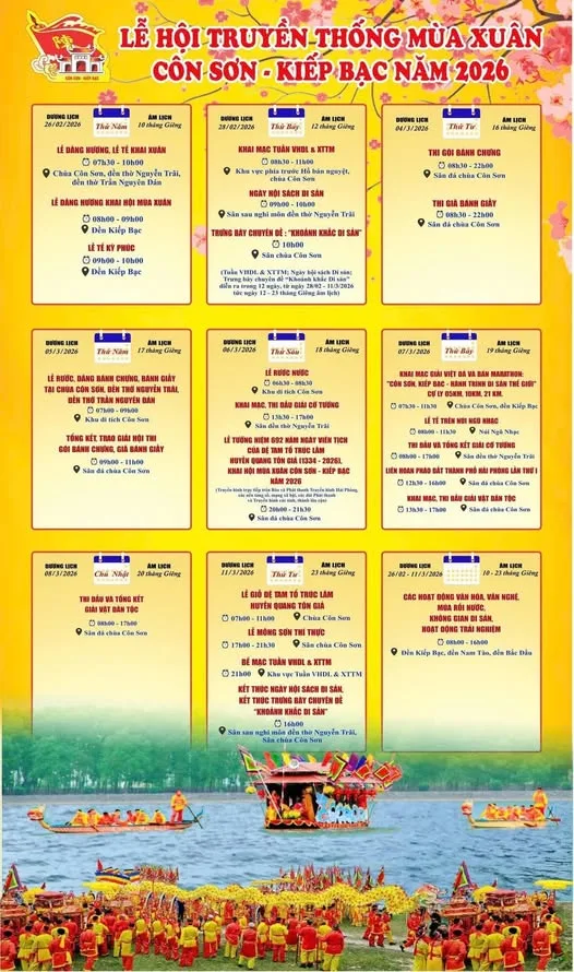 Sáng ngày 26/2/2026 (tức ngày 10 tháng Giêng năm Bính Ngọ), tại Côn Sơn - Kiếp Bạc, Ban Tổ chức Lễ hội mùa xuân Côn Sơn – Kiếp Bạc long trọng tổ chức Lễ dâng hương khai hội mùa xuân Côn Sơn – Kiếp Bạc năm 2026.
