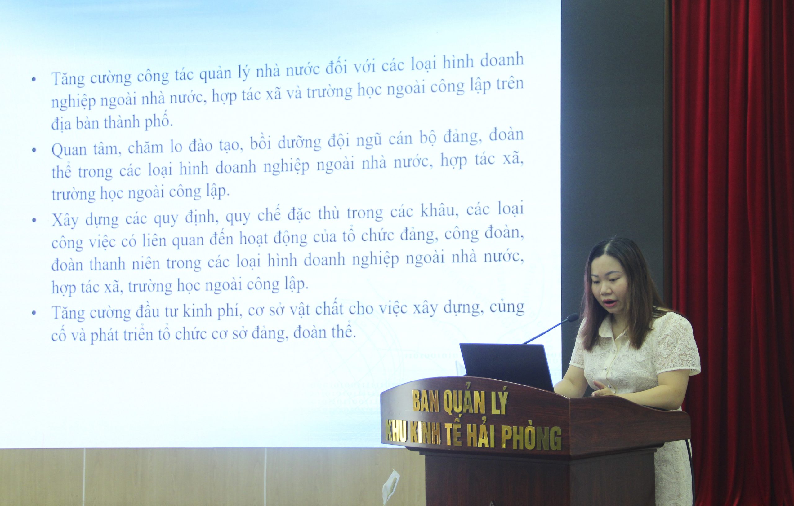 Trong buổi sinh hoạt, Phòng Lao động tham gia báo cáo chuyên đề do đồng chí Nguyễn Thị Hà Minh phó trưởng phòng Lao động báo cáo Thực hiện Nghị quyết số 28-NQ/TU ngày 10/11/2009 của Ban Thường vụ Thành ủy “về xây dựng, củng cố và phát triển tổ chức đảng, đoàn thể trong các loại hình doanh nghiệp ngoài nhà nước, hợp tác xã, đơn vị sự nghiệp ngoài công lập”