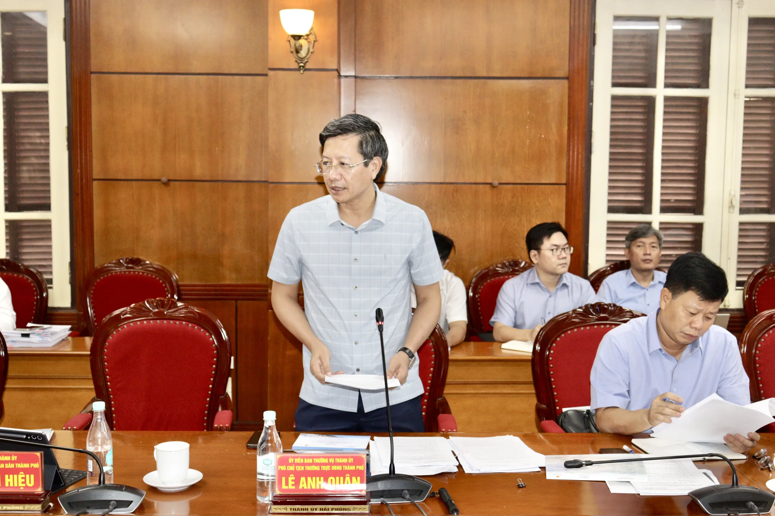 Phó Chủ tịch Thường trực UBND thành phố Lê Anh Quân báo cáo tại cuộc họp.