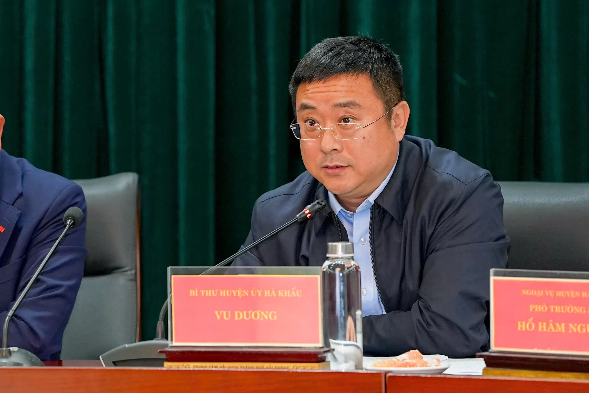 Ông Vu Dương, Bí thư Huyện ủy Hà Khẩu phát biểu tại cuộc làm việc.