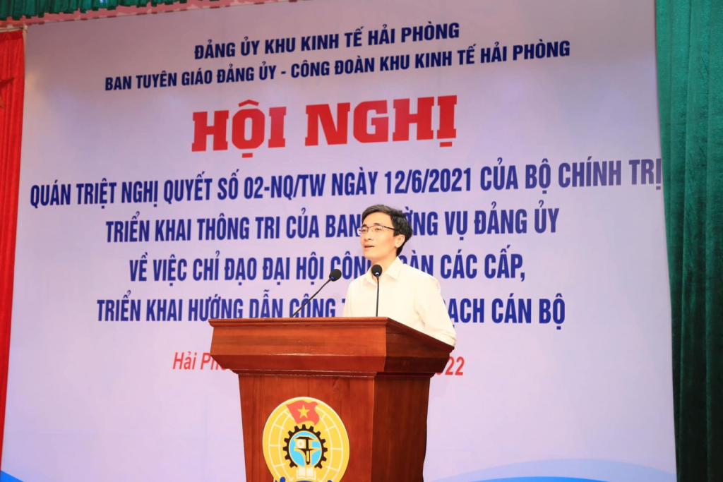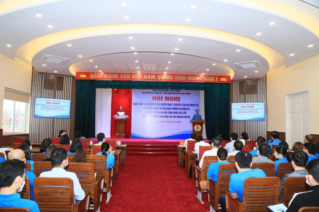 Sáng ngày 27/3/2022, Đảng ủy Khu kinh tế Hải Phòng tổ chức hội nghị quán triệt Nghị quyết số 02-NQ/TW ngày 12/6/2021 của Bộ Chính trị về đổi mới tổ chức và hoạt động của Công đoàn Việt Nam trong tình hình mới; Thông tri số 01-TT/ĐU ngày 24/3/2022 của Ban Thường vụ Đảng ủy về lãnh đạo Đại hội Công đoàn cơ sở và Đại hội IV Công đoàn Khu kinh tế Hải Phòng nhiệm kỳ 2023 – 2028 và hướng dẫn một số nội dung cụ thể về công tác quy hoạch cán bộ. Đến dự hội nghị có đồng chí Tống Văn Băng, Ủy viên Thành ủy, Chủ tịch Liên đoàn Lao động thành phố, các đồng chí trong Ban chấp hành Đảng bộ Khu kinh tế Hải Phòng, các đồng chí Bí thư các chi bộ trực thuộc, các đồng chí Ủy viên Ban Chấp hành Công đoàn Khu kinh tế, Chủ tịch Công đoàn cấp cơ sở. Cùng dự và đưa tin về hội nghị còn có đại diện một số cơ quan báo chí Trung ương và thành phố. Đồng chí Đào Phú Thùy Dương, Ủy viên Thành ủy, Bí thư Đảng ủy Khu kinh tế Hải Phòng chủ trì hội nghị: