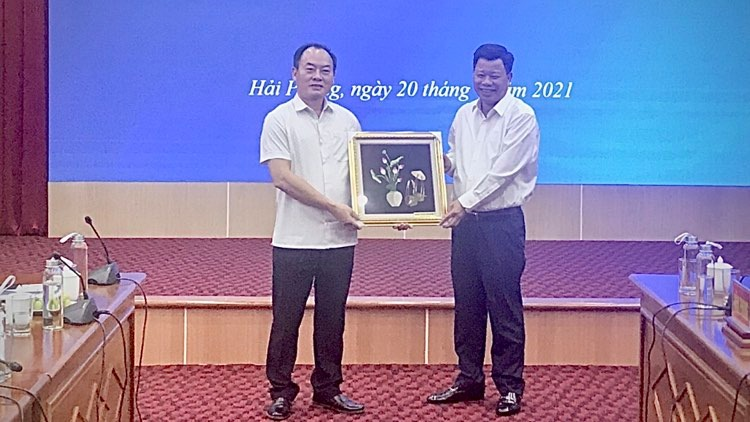 Đại diện Ban Quản lý Khu kinh tế Đông Nam – Nghệ An tặng quà lưu niệm cho Trưởng ban Ban Quản lý Khu kinh tế Hải Phòng