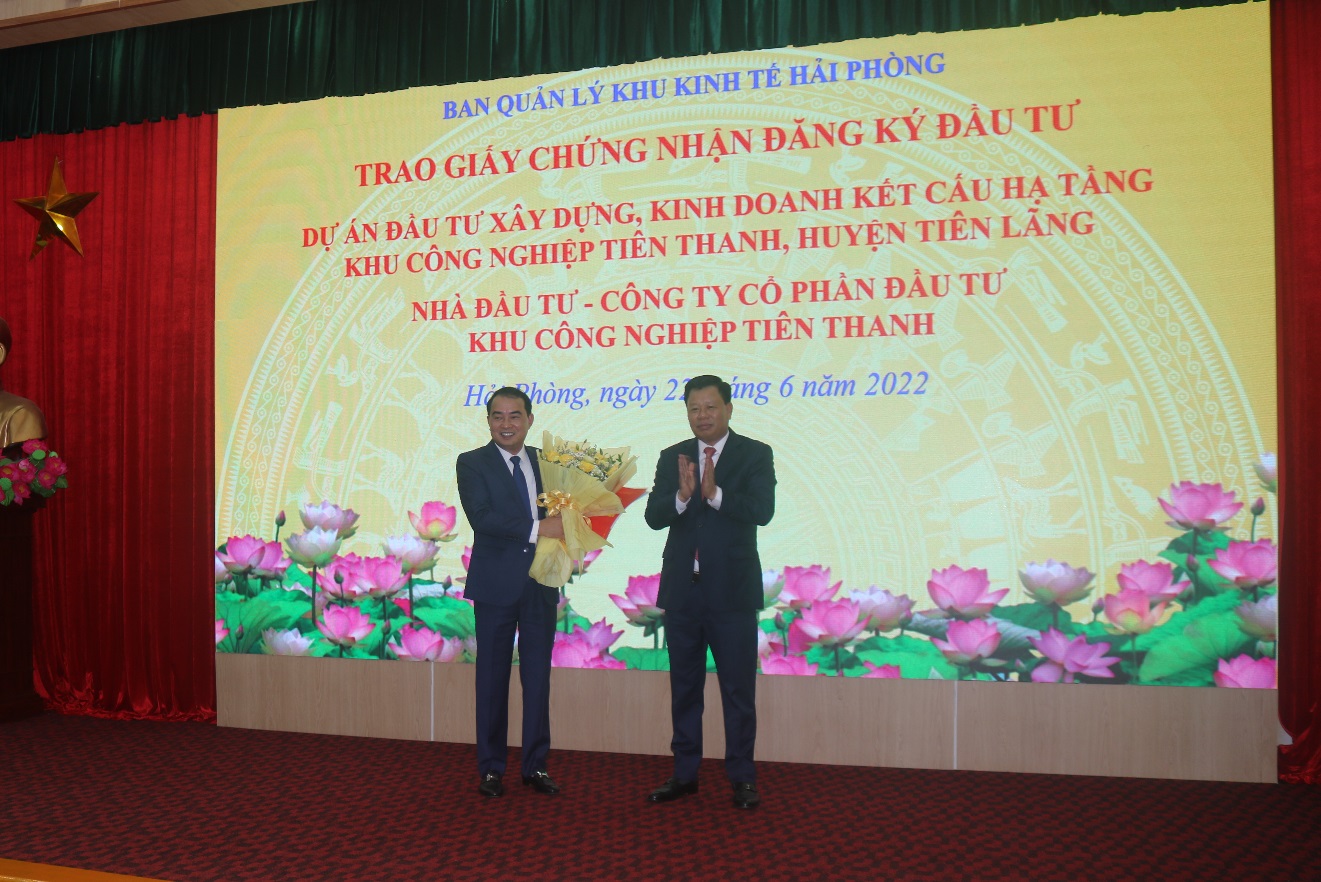 Ông Lê Trung Kiên – Ủy viên Ban Thường vụ Thành ủy, Trưởng Ban Quản lý Khu Kinh tế Hải Phòng tặng hoa chúc mừng và trao GCN đăng ký đầu tư cho đại diện Công ty Cổ phần Khu công nghiệp Tiên Thanh