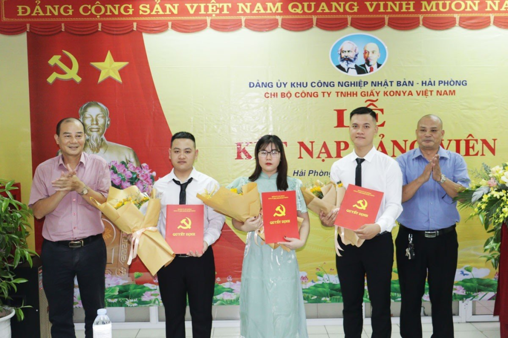 Chiều ngày 31/8/2023, Đảng ủy Khu công nghiệp Nhật Bản – Hải Phòng đã chỉ đạo Chi bộ Công ty TNHH giấy Konya Việt Nam tổ chức lễ kết nạp đảng viên cho các quần chúng ưu tú. 03 quần chúng ưu tú đã vinh dự được đồng chí Bí thư Chi bộ trao quyết định kết nạp, thực hiện nghi thức tuyên thệ, thề tuyệt đối trung thành với mục đích lý tưởng cách mạng của Ðảng, chấp hành nghiêm chỉnh Cương lĩnh chính trị, Ðiều lệ, nghị quyết, chỉ thị của Ðảng, pháp luật của Nhà nước. Phát biểu tại Lễ kết nạp: Đồng chí Nguyễn Công Thành, Phó Bí thư Thường trực Đảng ủy Khu kinh tế thay mặt Ban Thường vụ Đảng ủy chúc mừng và ghi nhận những nỗ lực, phấn đấu của các đồng chí Đảng viên vừa mới kết nạp. Đồng chí căn dặn: “Là đảng viên mới các đồng chí phải thường xuyên học tập, nắm bắt các nghị quyết của Đảng, các nhiệm vụ chính trị của chi bộ đảng trong doanh nghiệp có vốn đầu tư nước ngoài. Trên cơ sở đó không ngừng học tập, rèn luyện, phấn đấu để sớm trở thành Đảng viên chính thức”.
