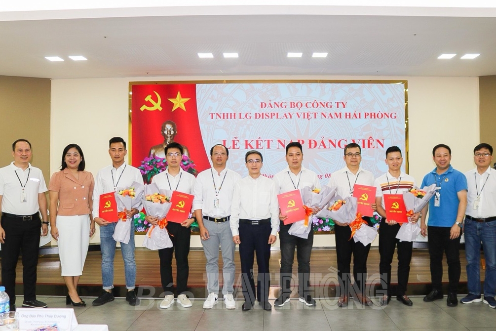 Đại diện lãnh đạo Đảng ủy Khu kinh tế Hải Phòng trao quyết định và tặng hoa chúc mừng các đảng viên mới thuộc Đảng bộ Công ty TNHH LG Display Việt Nam Hải Phòng. Ảnh: Lê Hiệp