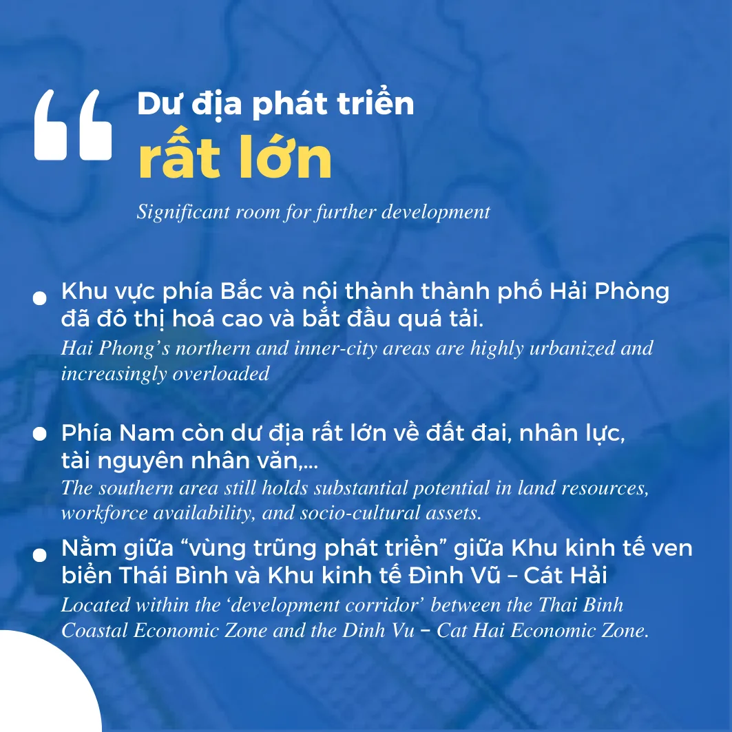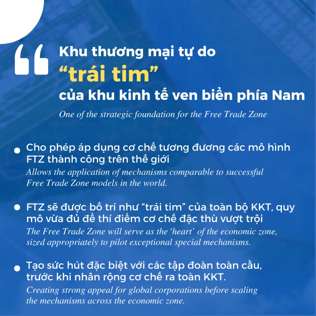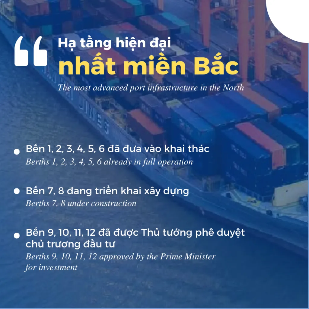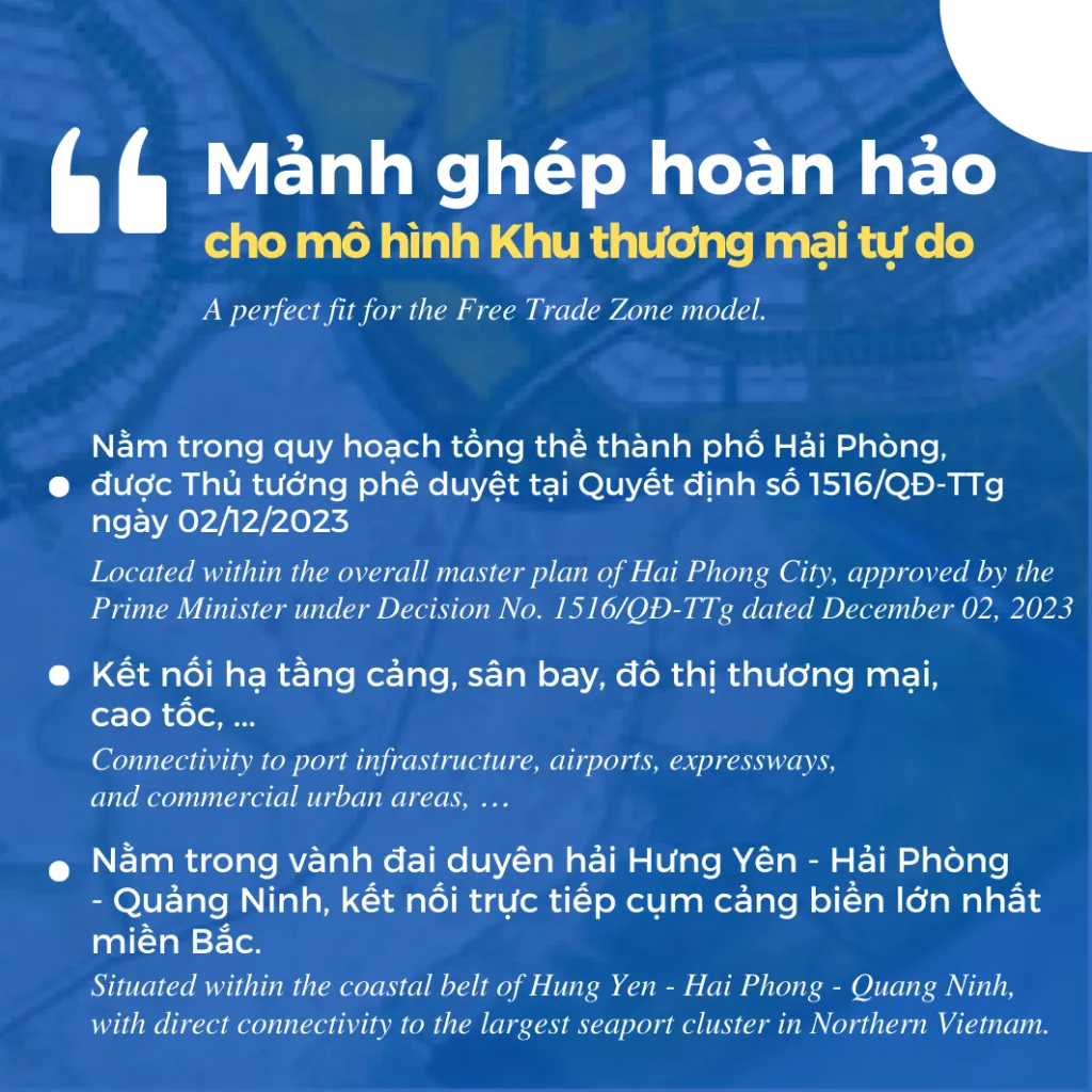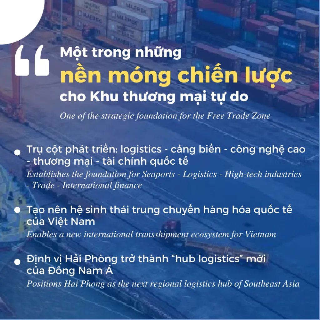 Hai Phong Free Trade Zone (Hai Phong FTZ) is built with the strategic goal of becoming an international Maritime Economic and Logistics Center, creating a new and breakthrough growth engine for the Northern region and the whole country. This area creates the most open and competitive investment environment in Vietnam, focusing on attracting high-tech projects, R&D, finance, logistics, and high-quality trade services.